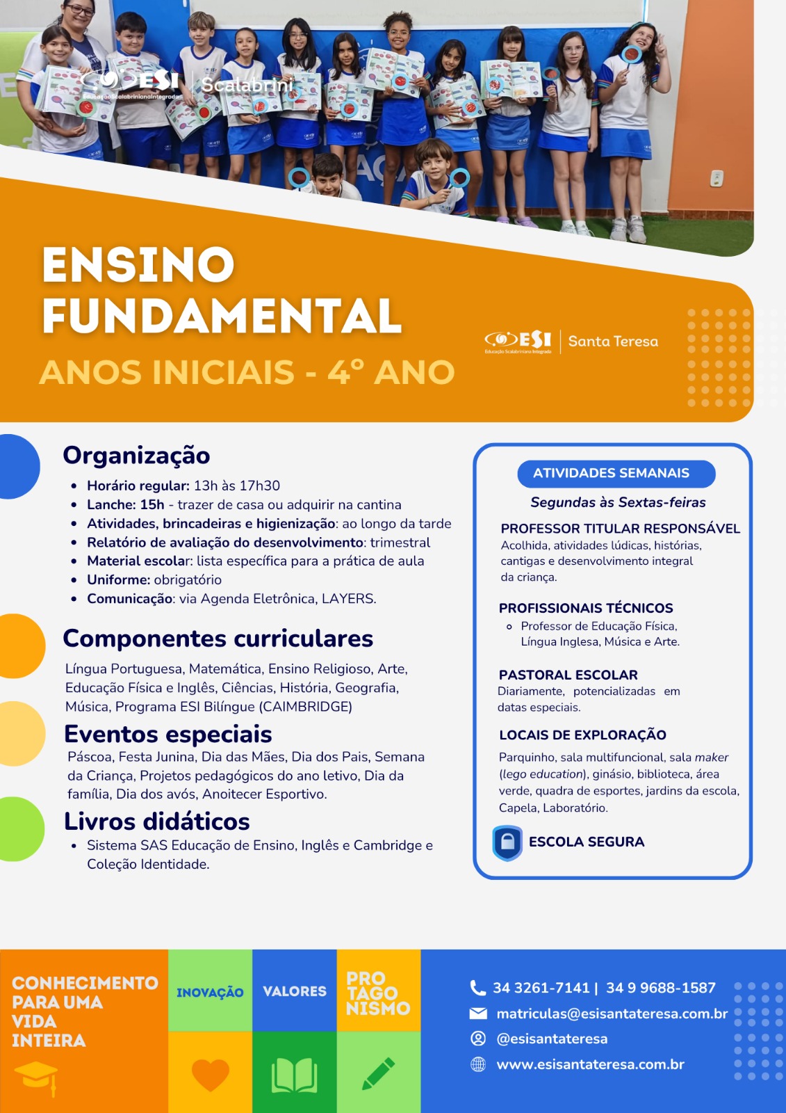 De acordo com os princípios da Educação Scalabriniana Integrada, o Ensino Fundamental deve contemplar os quatro pilares estabelecidos pela UNESCO (aprender a aprender, aprender a fazer, aprender a ser e aprender a conviver), pois o educando constituiu-se a partir das interações sociais, nos múltiplos ambientes dos quais participa.